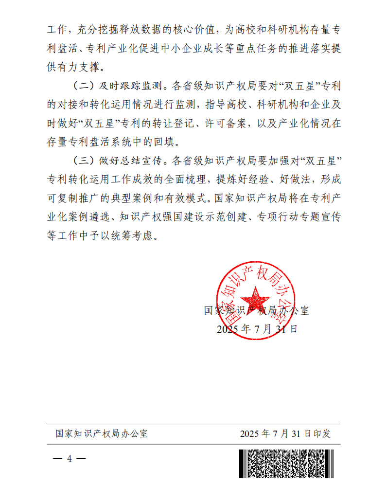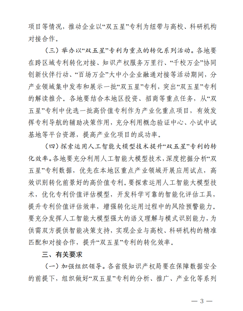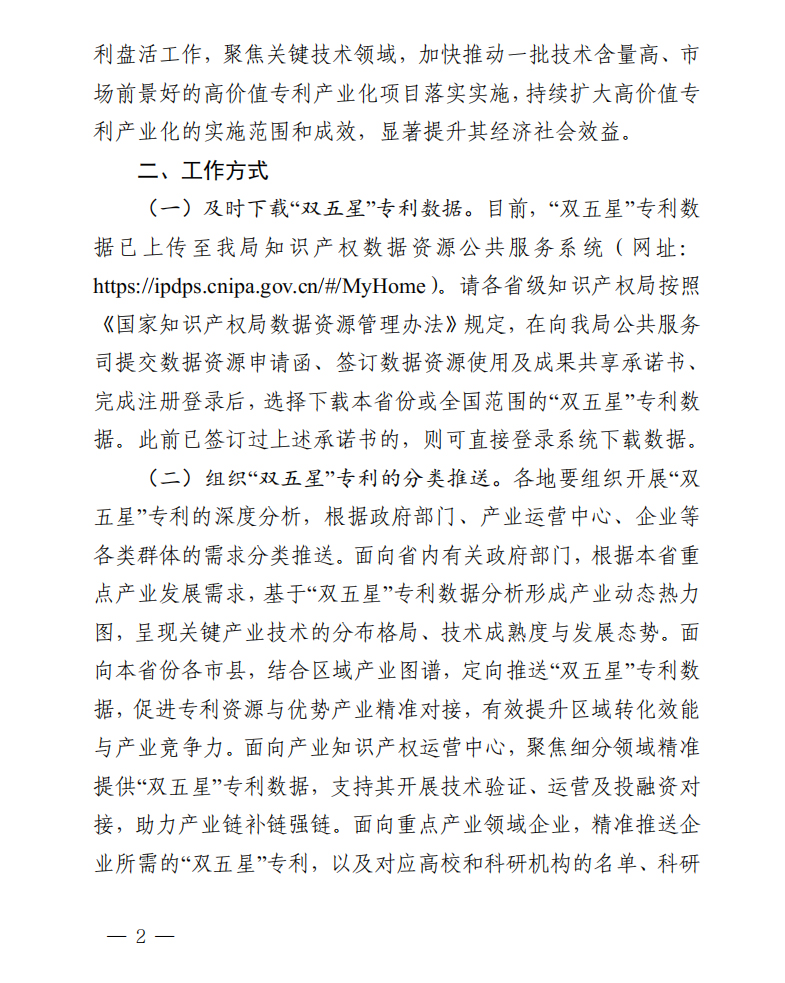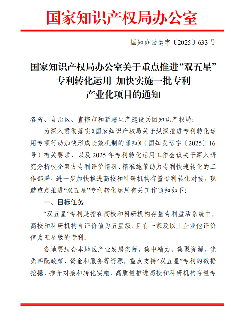 国家知识产权局办公室关于重点推进“双五星” 专利转化运用 加快实施一批专利 产业化项目的通知